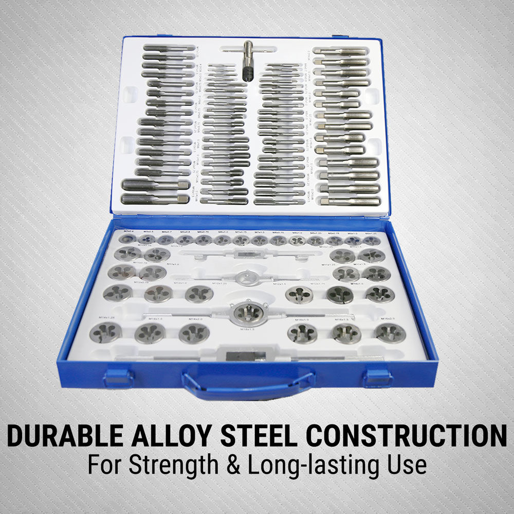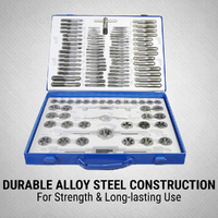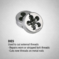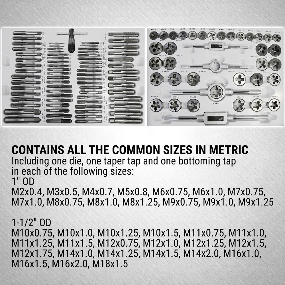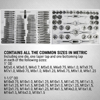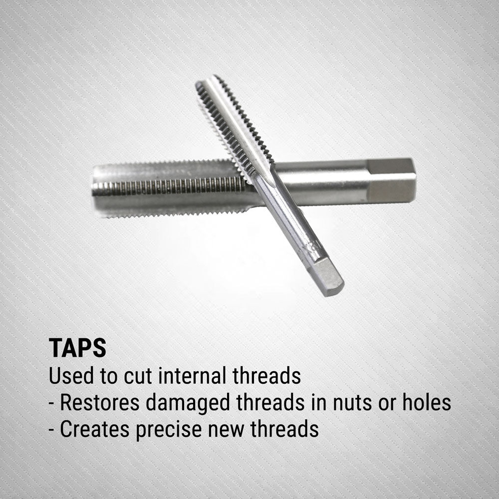 Including one die, one taper tap and one bottoming tap in each of the following sizes: