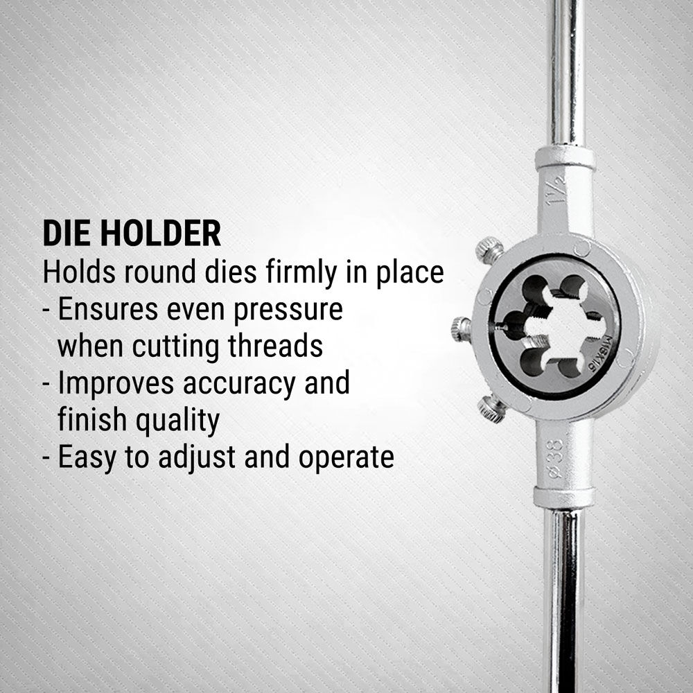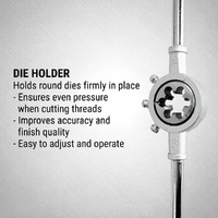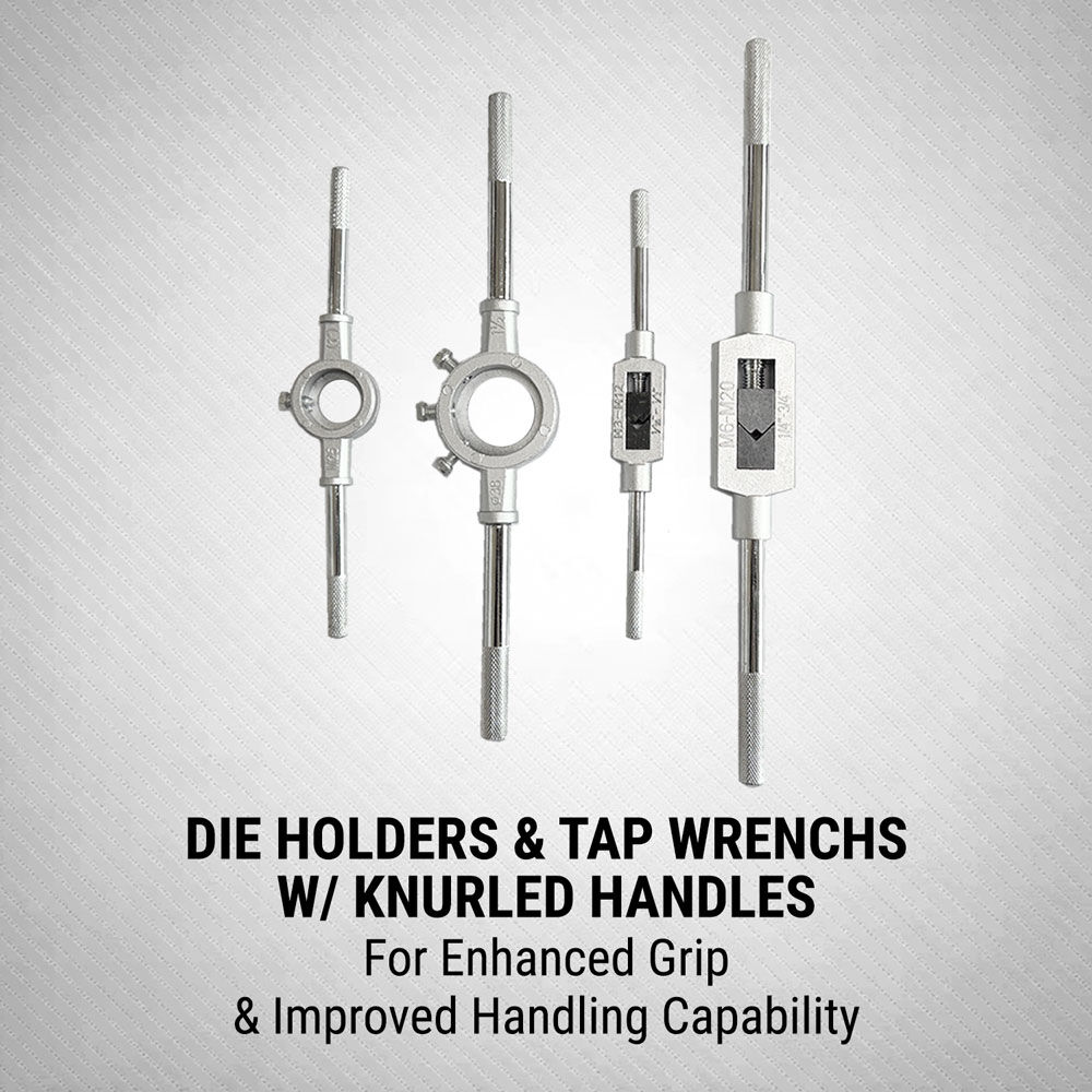 • Die holder and tap wrench included with knurled handles for improved grip and handling capability
