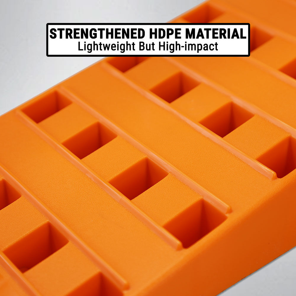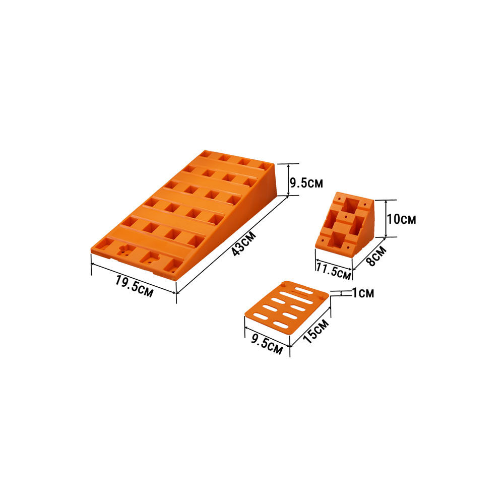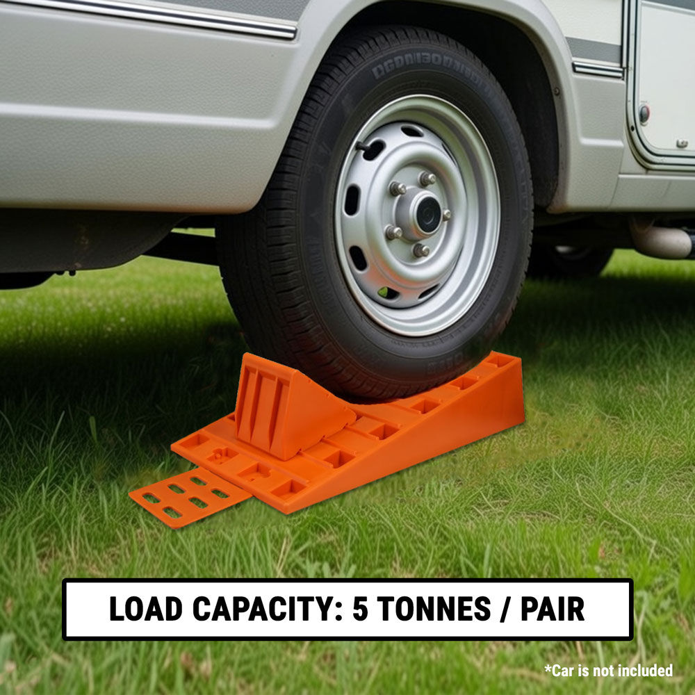 Designed for caravans, RVs, motorhomes, and trailers, these ramps provide a simple and reliable solution for levelling your vehicle. This strong and durable wheel levelling ramp kit includes a pair of ramps, chocks that lock onto the ramps to prevent slippage, and anti-slip skid plates for added stability. Made from heavy-duty, high-visibility material, these ramps are durable, easy to use, and ideal for camping and travel.