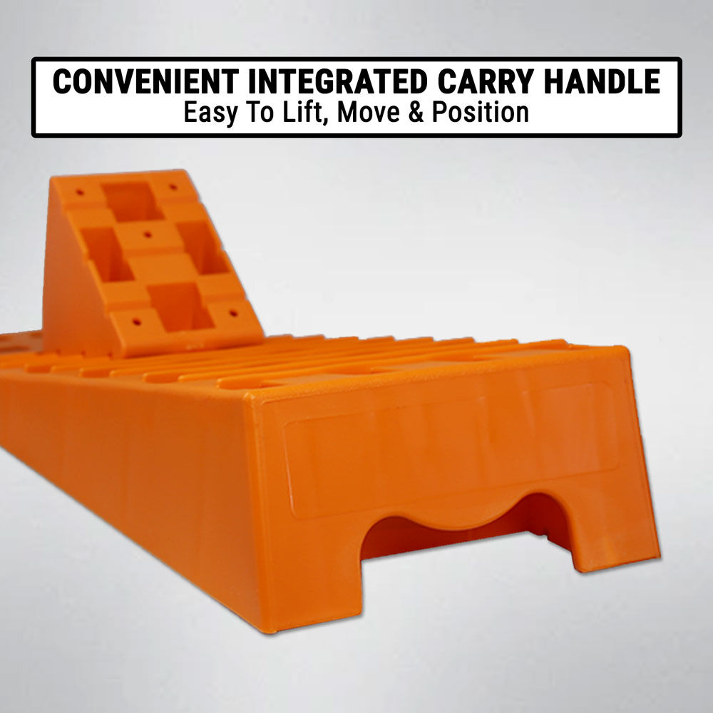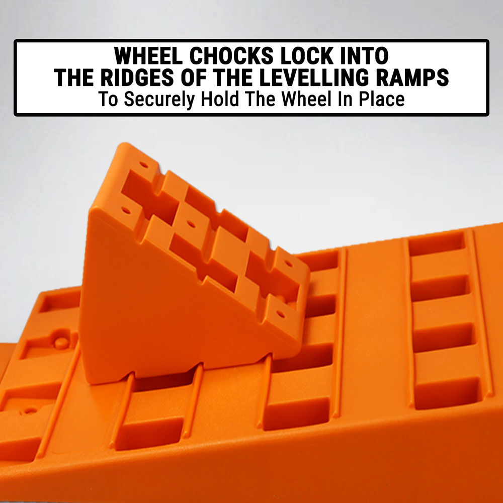 • Wheel chocks lock into the ridges of the levelling ramps to securely hold the wheel in place