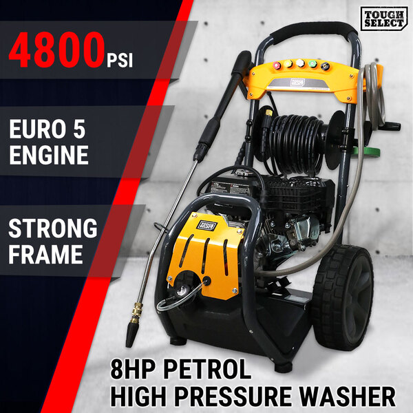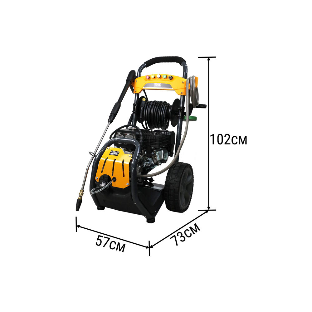 Eliminate dirt and stains effortlessly with the powerful force of this petrol-powered pressure washer. It boasts an innovative design, featuring a compact 8HP 4-stroke OHV gasoline engine, ensuring easy operation and a steady flow of power.