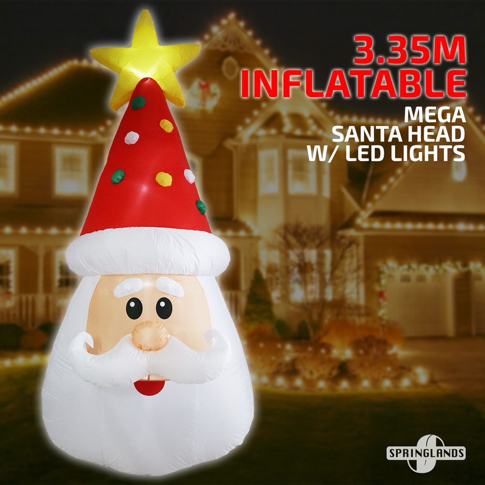 This inflatable Mega Santa Head creates a cheerful festive environment. This lighted, self-inflating Mega Santa Head comes with everything you need for set-up and installation, including build-in fan, pegs and ropes. It has energy-efficient, long-lasting LEDs inside lighting up for better nighttime viewing. It’s perfect for Christmas parties, family gatherings, events, and outdoor decoration.