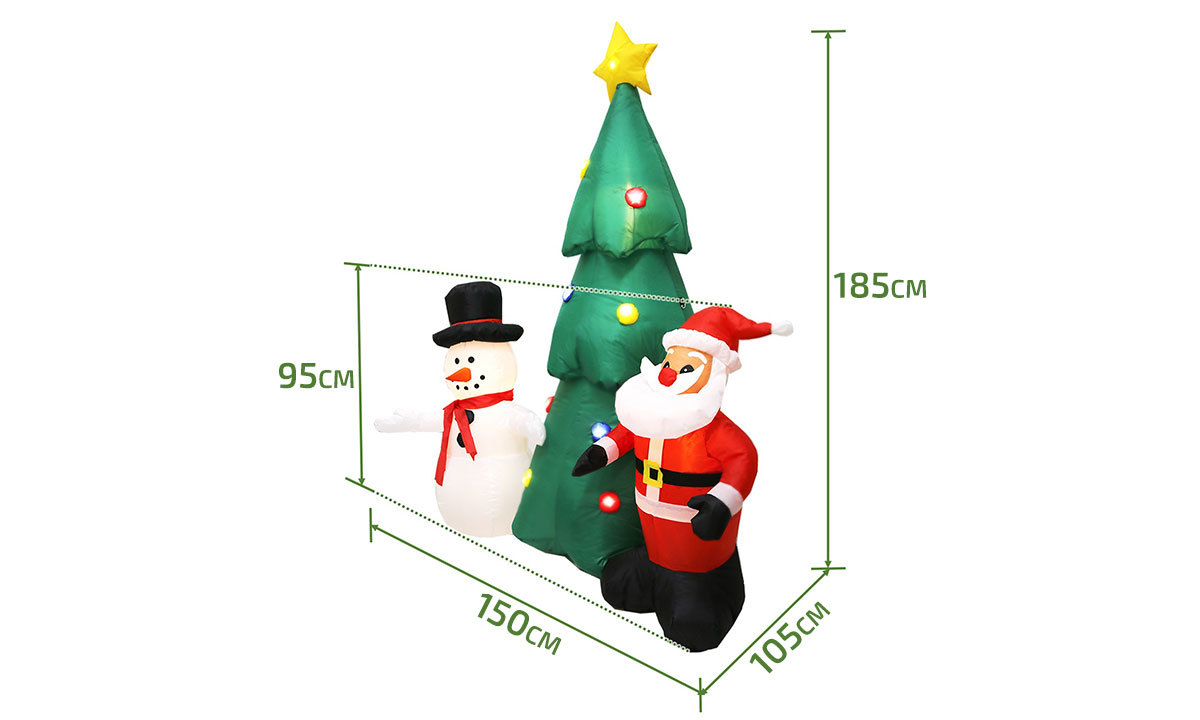This inflatable Snowman, Santa and Tree creates a cheerful festive environment. This lighted, self-inflating nowman, Santa and Tree comes with everything you need for set-up and installation, including build-in fan, pegs and ropes. It has energy-efficient, long-lasting LEDs inside lighting up for better nighttime viewing. It’s perfect for Christmas parties, family gatherings, events, and outdoor decoration.