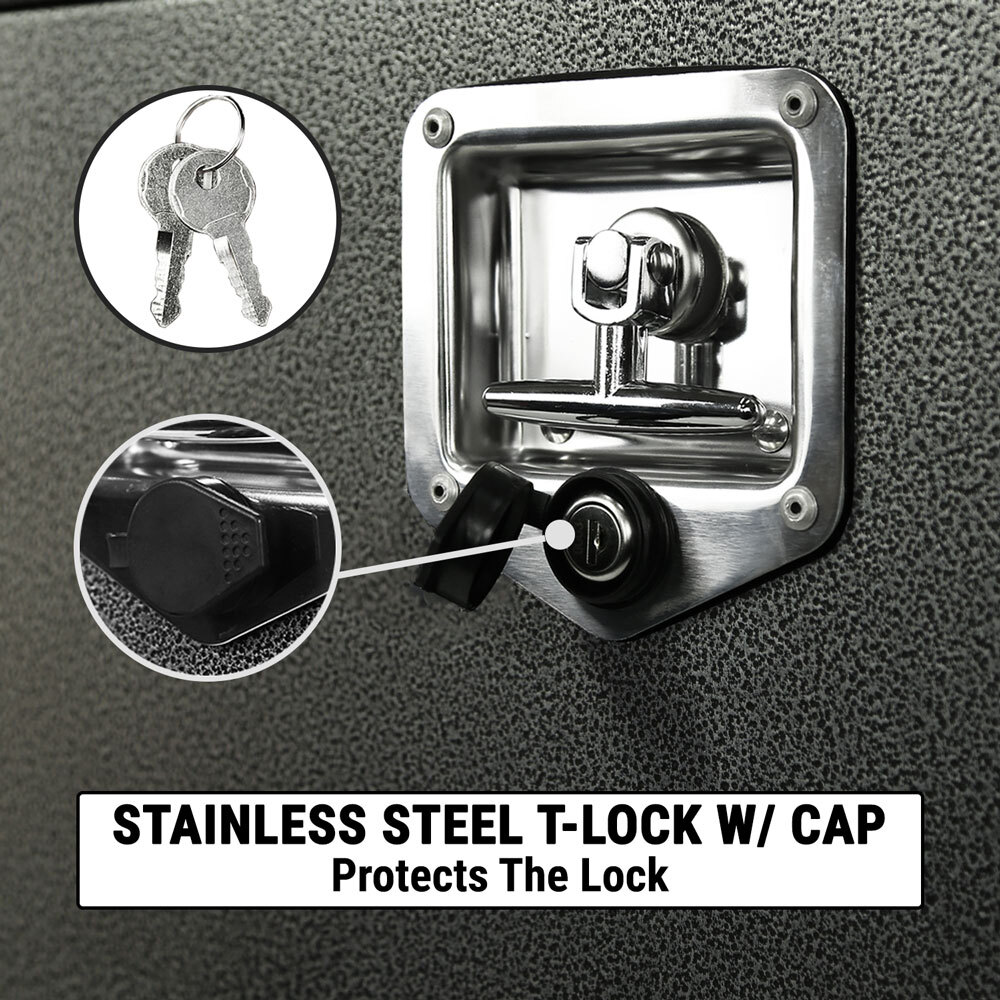 This Steel Undertray Toolbox is suitable for the demanding work environments of Australian tradies. Heavy duty toolbox made out of 1.5 mm thick steel. This is designed for mounting under the Ute Tray or Trailer which is a great way to store your valuables. Also it is equipped piano hinges with a heavy duty stainless steel T-Lock with spring. It also features water and dust resistant seal to protect your items.