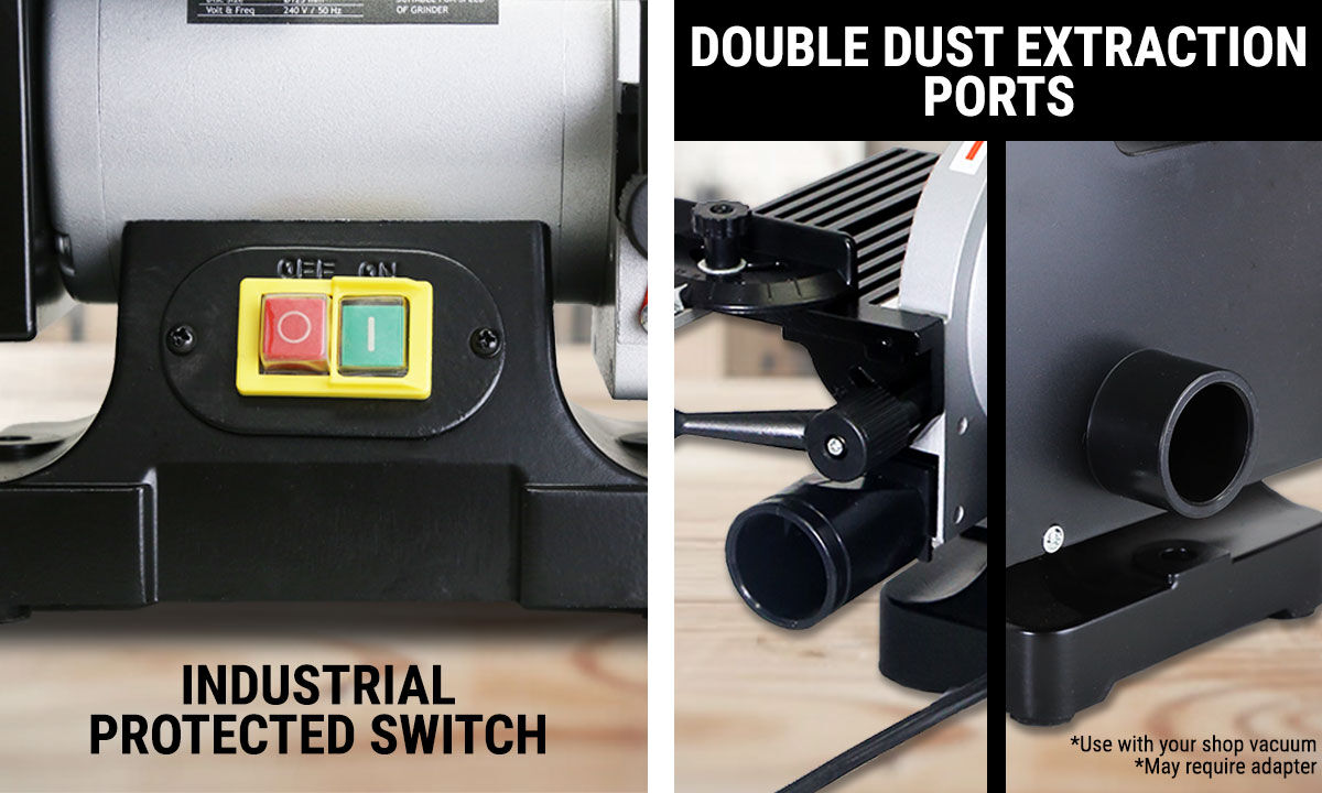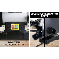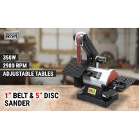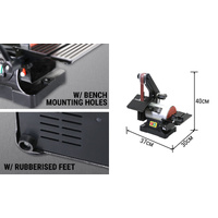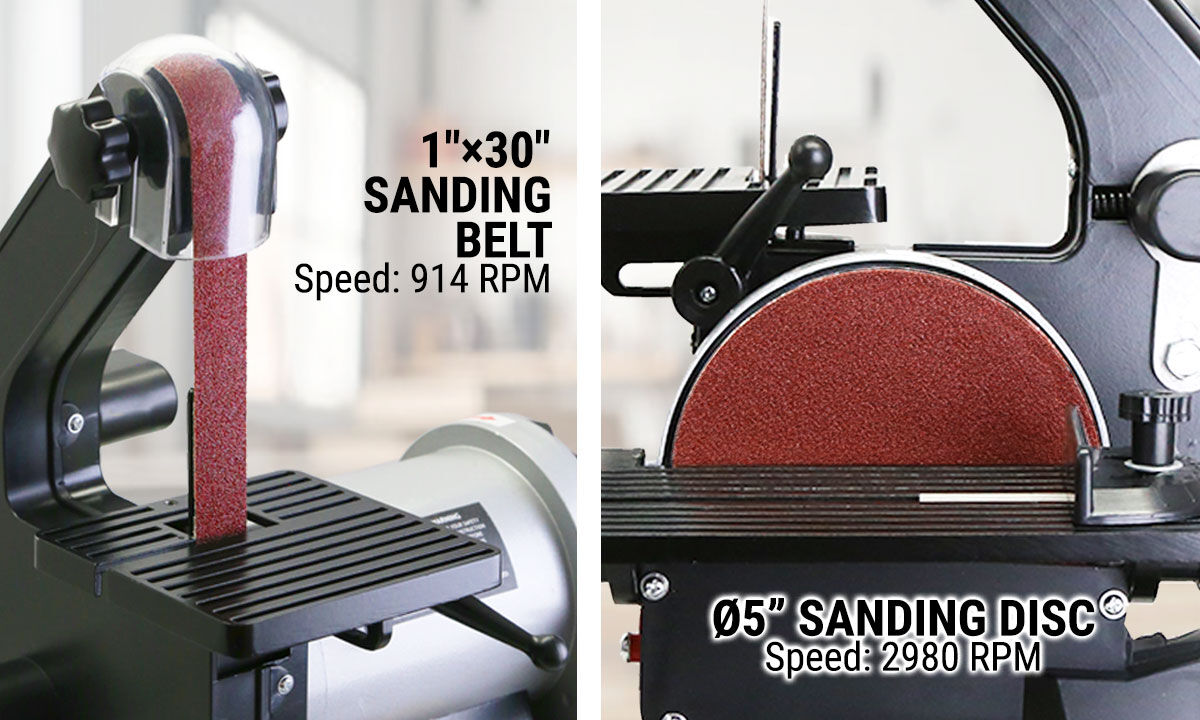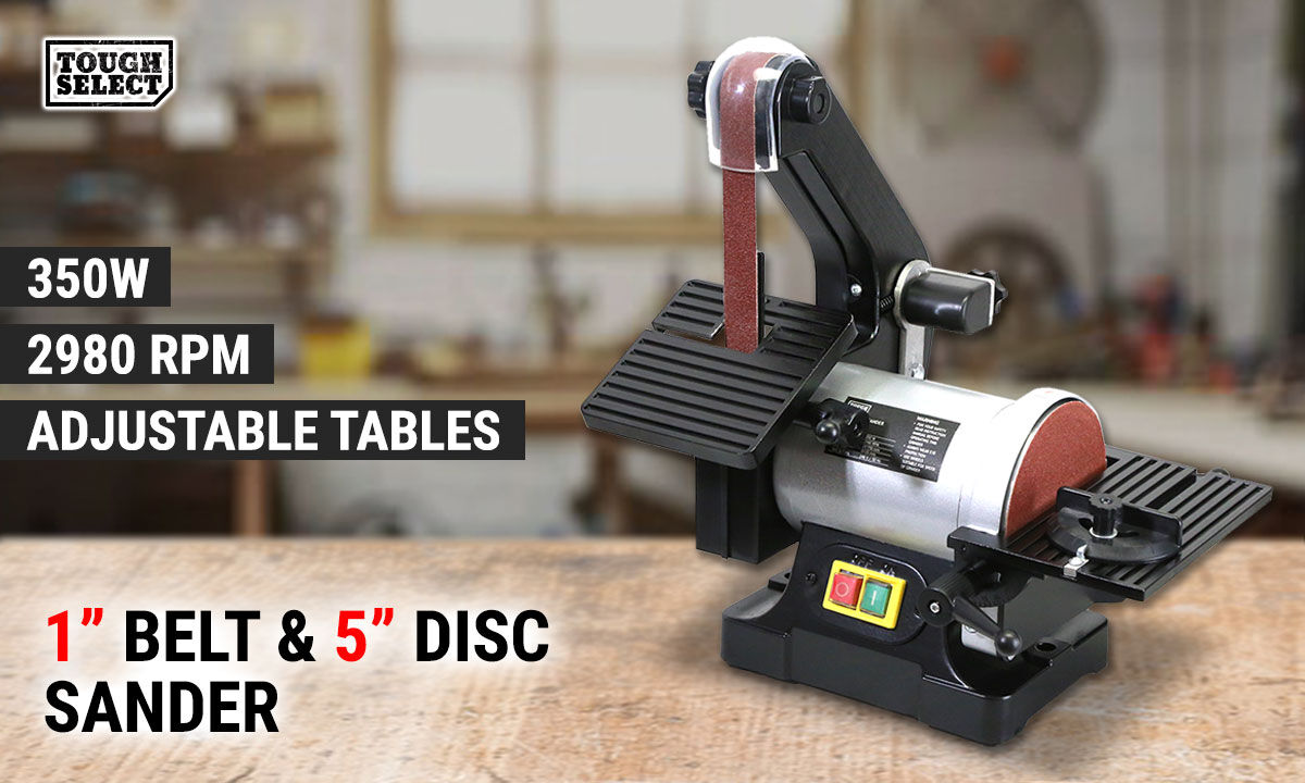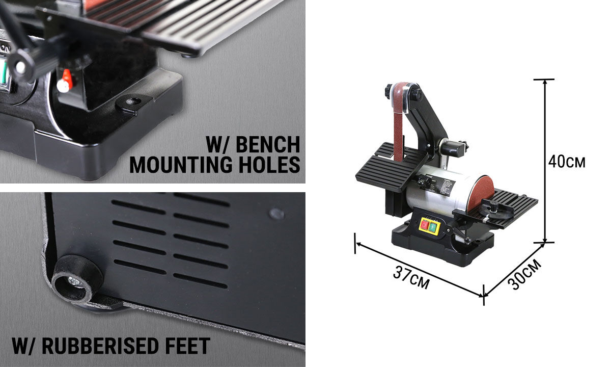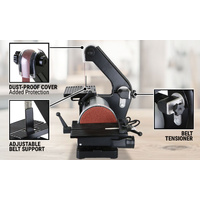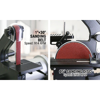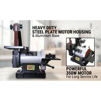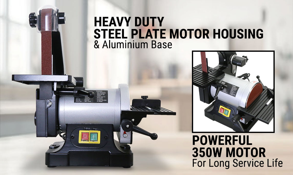 • Equips a 25x750mm vertical belt for longer edges and a 125mm disc sander for detailed work, with a belt speed of 914RPM and a disc speed of 2980RPM