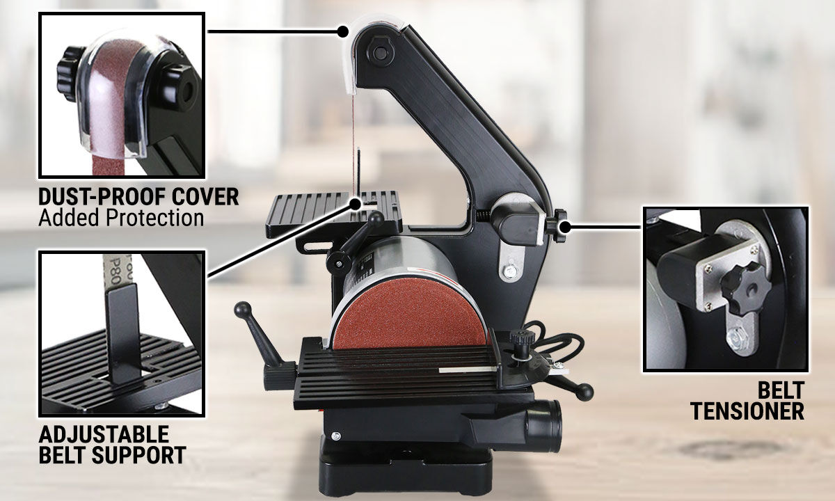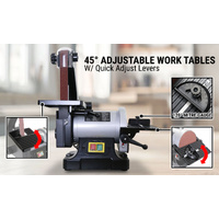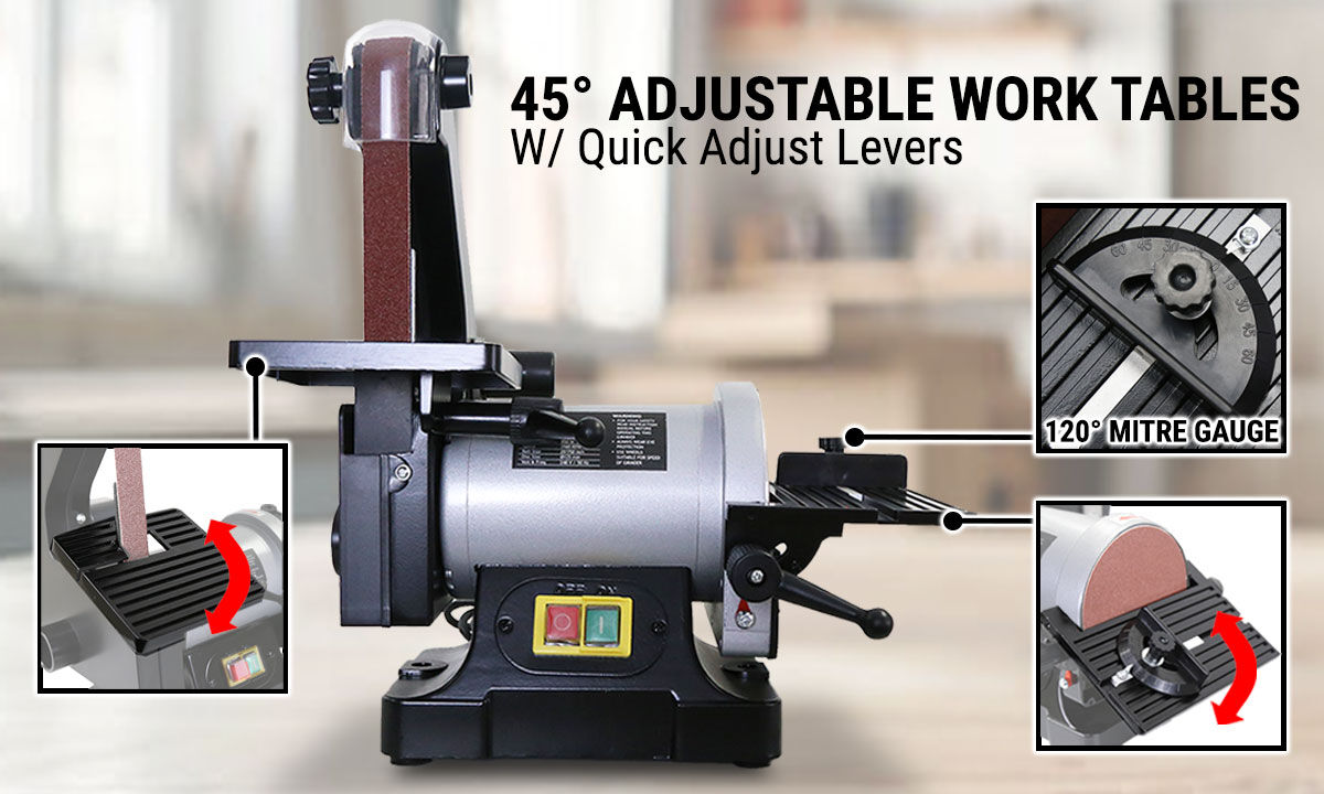• Both belt and disc offer worktables with quick-adjust levers, adjustable up to 45 degrees for easy chamfering, plus a mitre gauge for ultimate precision on the disc sander